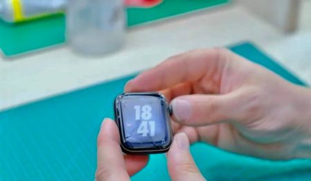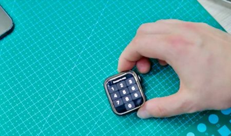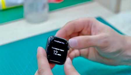 - В руках нашего специалиста Apple Watch с механическими повреждениями на верхней части дисплея, при этом на все команды тачскрин реагирует стандартно, как до повреждений.