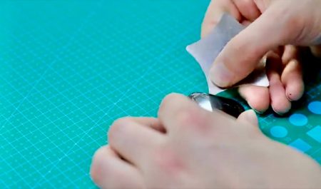 - Срезав стекло, просовываем между дисплеем и стеклом тонкую, но плотную пленку и аккуратно разделяем компоненты.