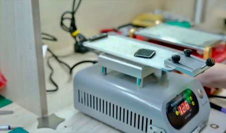 - Для начала кладем часы на подогрев, чтобы проклейка между экраном и корпусом размягчилась, чтобы легче снимать осколки и отклеить экран от корпуса.