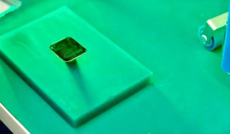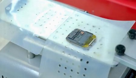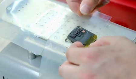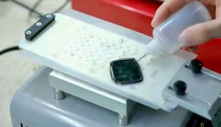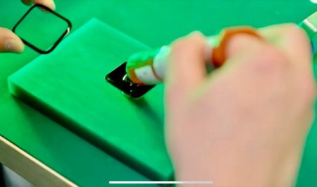 - После того, как клей равномерно распространился по всему периметру экран, с обратной стороны устраняем тряпочкой его излишки. Центруем дисплей на стекле. И слегла засвечиваем клей ультрафиолетом, чтобы при помещении в камеру для сушки он не съехал.