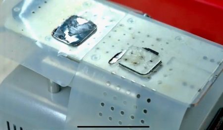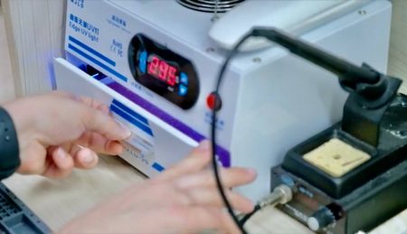 - Теперь снимаем дисплейный модуль, кладем снова на подогрев (температура 100-120 градусов), чтобы клей (склеивает стекло и дисплей между собой) разогрелся и стал мягче. Что даст возможность проще снять остальные неприятные осколки.