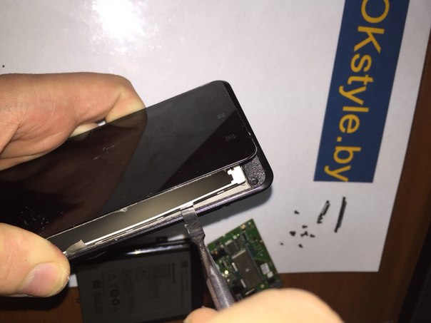 Настал момент истинный, пора браться за настоящую работу. Предварительно прогрев лицевую часть разобранного смартфона (экрана), не спеша приподымаем его лопаткой по всему периметру.