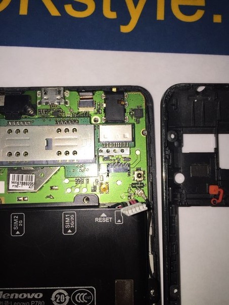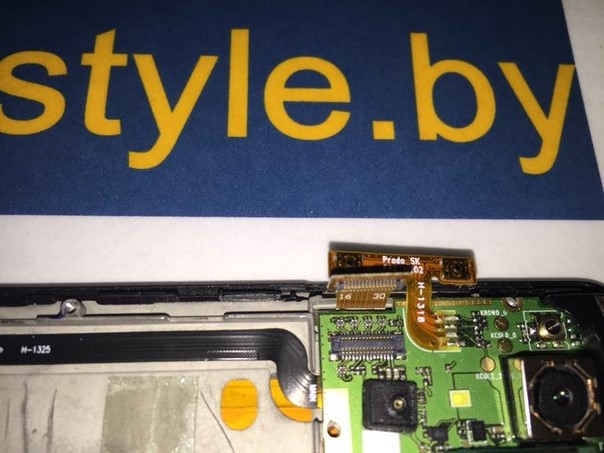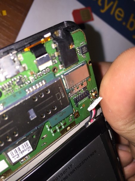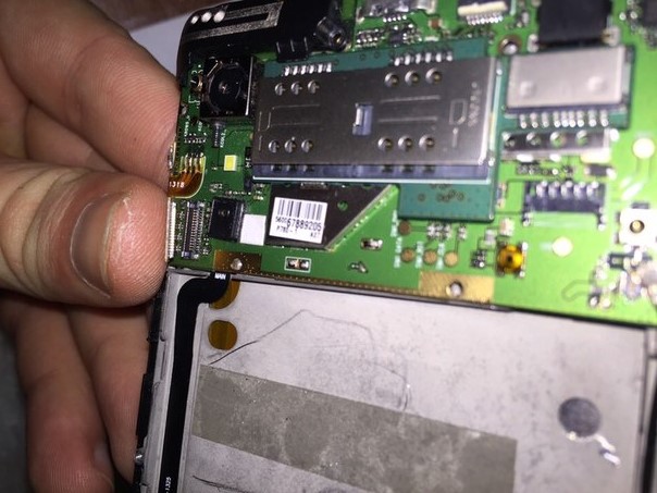 Теперь, когда дисплей крепко стоит на месте, начинаем обратный процесс, собираем смартфон.- Защелкиваем шлейф подсветки нижних сенсорных кнопок, что находится на обратной стороне системной платы.